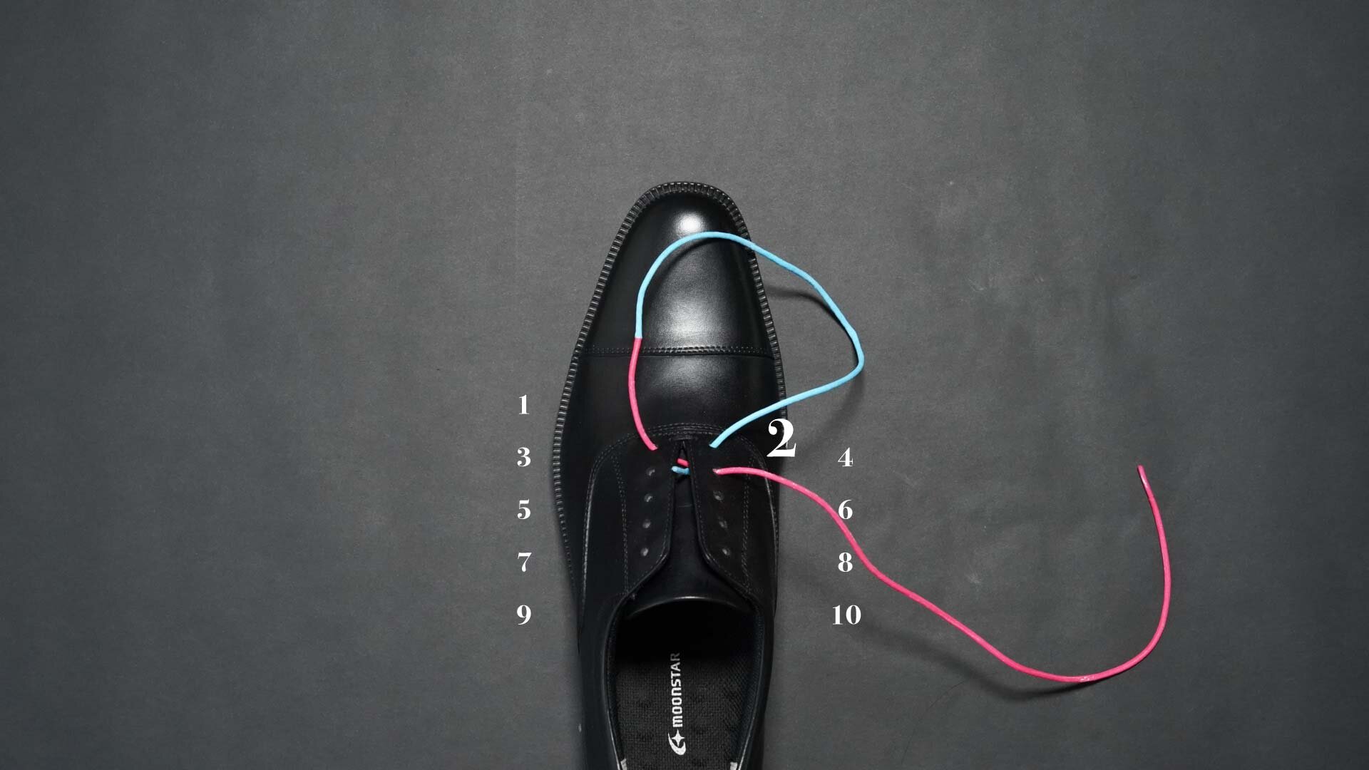 紐が平行に並ぶ通し方。「シングル」と同じく、ビジネスやドレスシューズによく用いられます。シングルと比較すると手順は少し複雑な一方、左右均等に締まりゆるみにくいことが特徴です。