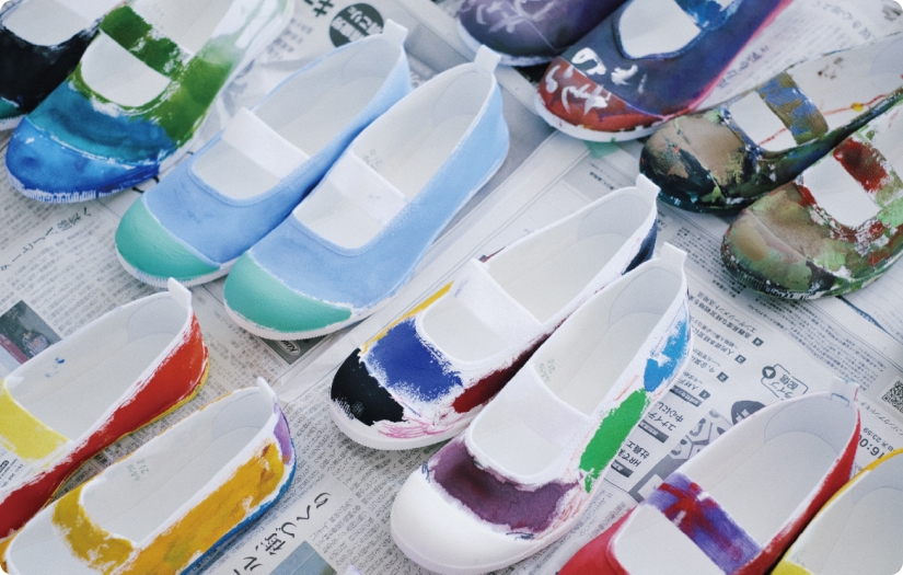 150周年事業の一環として「I’m UWABAKI ~MoonStar Identity Project~」を開催しました。日本の子どもの「自己肯定感」は欧米など6カ国と比較し、最も低いとのこと。そんな他国と比べ自己肯定が苦手な日本の子どもたちに、「みんなと同じだけど、自分の色を持った上履き」を通して自分のアイデンティティを認識し、適切な自己肯定感を育んでもらいたいと考え企画したプロジェクトです。