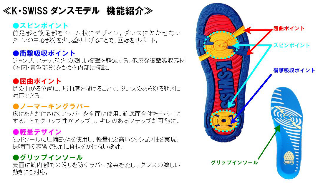 K・SWISSダンスモデルの新作は、ソールの踏みつけ部分とかかとにドーム状の"スピンポイント"を配置し、ダンスに欠かせないターンを