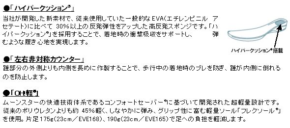今回の新作2商品(EVE165/EVE168)に初めて搭載した「ふわピタ中敷®」とは、足入れした 瞬間から足を優しく包み込む抜群のフィット感を感じられる低反発インソールです。適度なクッションが歩行時の衝撃を吸収し、足への負担を軽減します。 また、アウトソールの踵部分に「ハイパークッション®」を搭載することで、高反発弾性と衝撃吸収性を備え、弾むような履き心地を実現しました。加えて、アウトソール底面に「スクラッチラバー」を採用。スクラッチラバーの中に含まれている「もみがら」が水分を吸収し、足を滑りにくくします。この他にも、踵が内側に倒れるのを防止する「左右非対称カウンター」や片足200g以下の「OH!軽®」設計など、各種の機能を備えています。