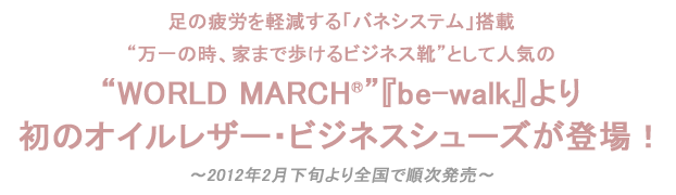 株式会社ムーンスター(本社:福岡県久留米市/社長:猪山 渡)は、歩きやすさを追求したウォーキングシューズブランド"WORLD MARCH®(ワールドマーチ)"の『be-walk(ビーウォーク)』シリーズより、脚の疲労を軽減する「バネシステム」を搭載したビジネスシューズの新作、3商品 (各10,290円)を、2012年2月下旬より、全国の靴専門店・量販店で順次販売します。