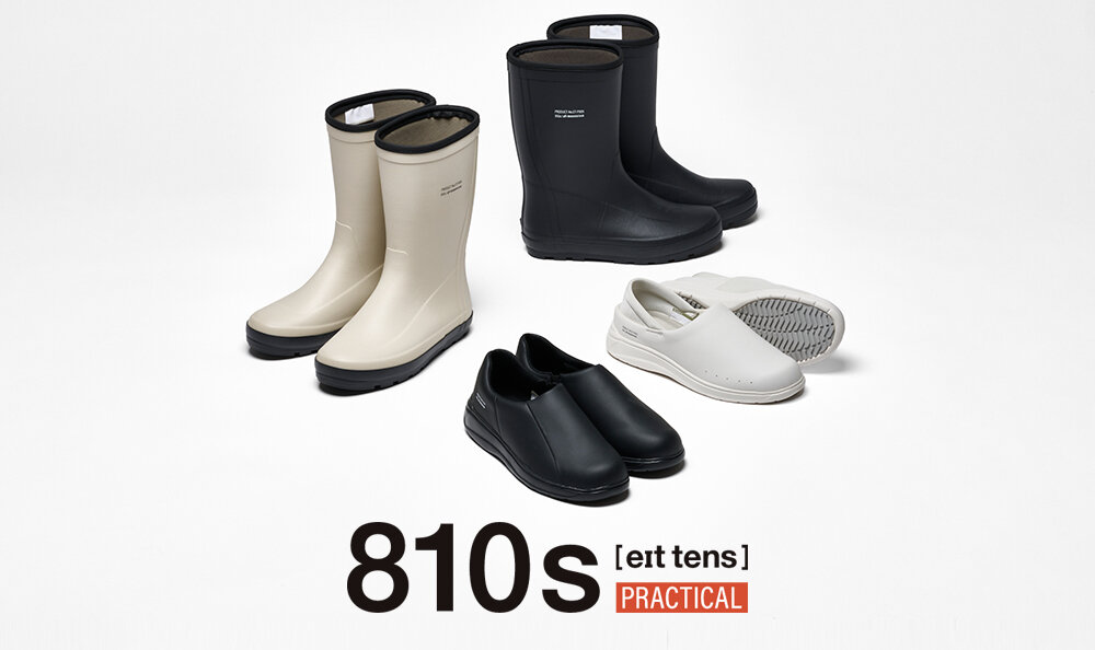 ムーンスターが培った専門分野への靴づくりのノウハウを日常で使いやすい道具へと再構築してきた810s。PRACTICALは810sのフィロソフィーを基に、日々の仕事にちょうどいいフットウェアを提案するプロユースラインです。今回、多様な現場に対応する、実用性を重視したラバーブーツタイプの「ET-P005」が新たに加わります。