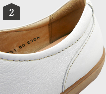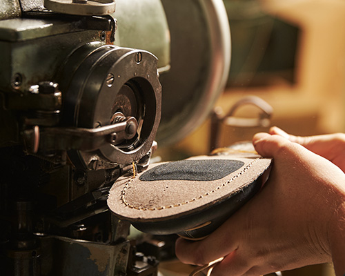 ひと針ひと針、甲の部分を縫うことで、やわらかく足にフィット。屈曲性が高く、はじめて履いたその日から足になじみます。また、素朴な風合いが生まれるのも、この製法ならでは。